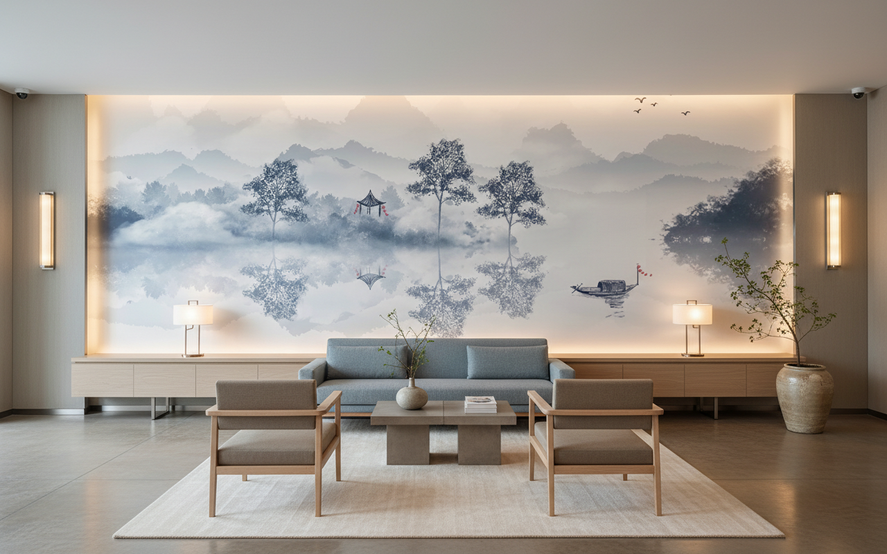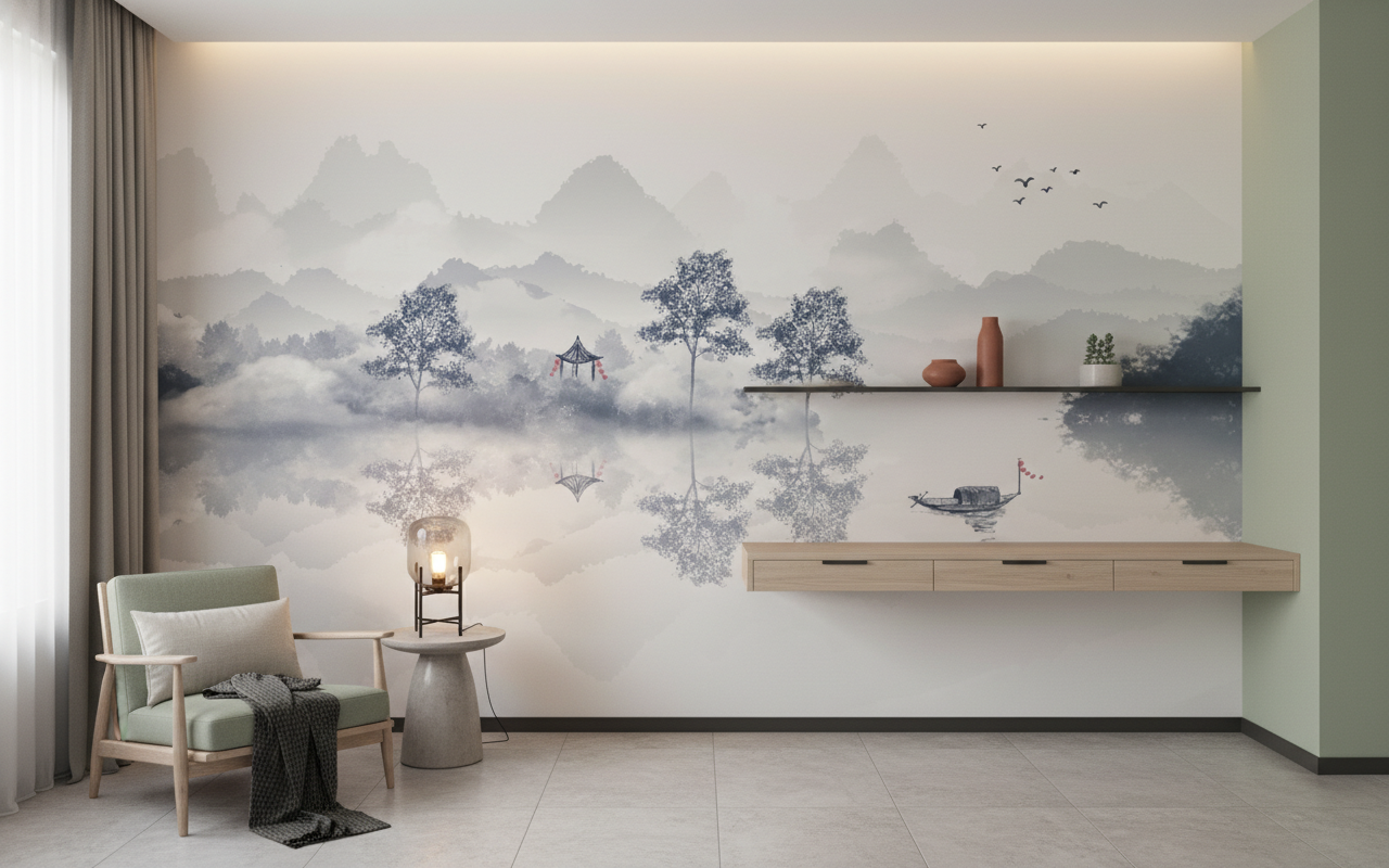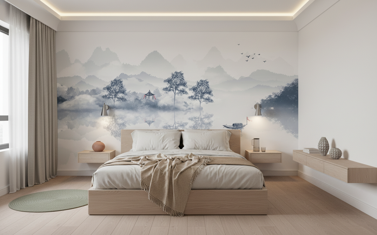 Parfaitement adapté pour sublimer un salon contemporain ou une chambre parentale, ce papier peint panoramique s’épanouit particulièrement derrière un canapé épuré ou une tête de lit minimaliste. Dans un bureau moderne, il favorise la concentration tout en offrant une échappée visuelle apaisante. Associez-le à du mobilier en bois naturel aux lignes japonisantes, des textiles en lin blanc ou beige, et quelques accessoires en céramique mate pour créer une atmosphère zen authentique. Les tons neutres de ce revêtement mural s’harmonisent parfaitement avec une palette décorative minimaliste scandinave ou wabi-sabi, où prime la beauté de l’imperfection naturelle.
