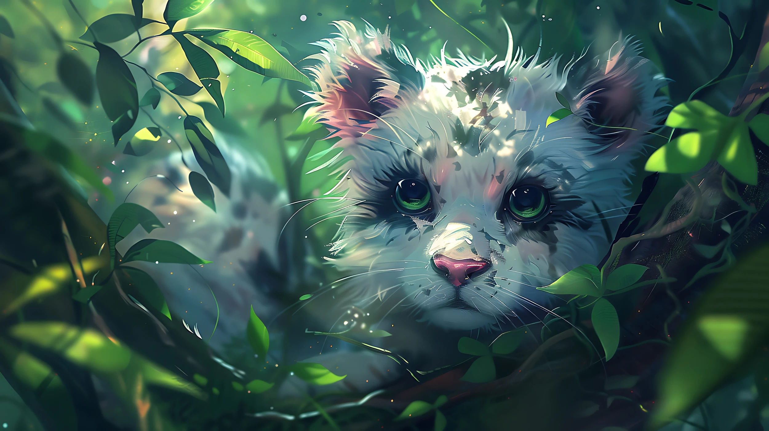 Cette création artistique exceptionnelle dévoile un félin aux traits délicats, dont le pelage gris-blanc nuancé de touches colorées semble vibrer sous les rayons de soleil jungle. Son museau rosé et ses yeux verts perçants créent une connexion émotionnelle immédiate, tandis que sa fourrure ébouriffée témoigne d’une authenticité sauvage troublante. L’artiste a magistralement capturé cette expression à la fois vulnérable et mystérieuse, caractéristique des animaux de la forêt tropicale.