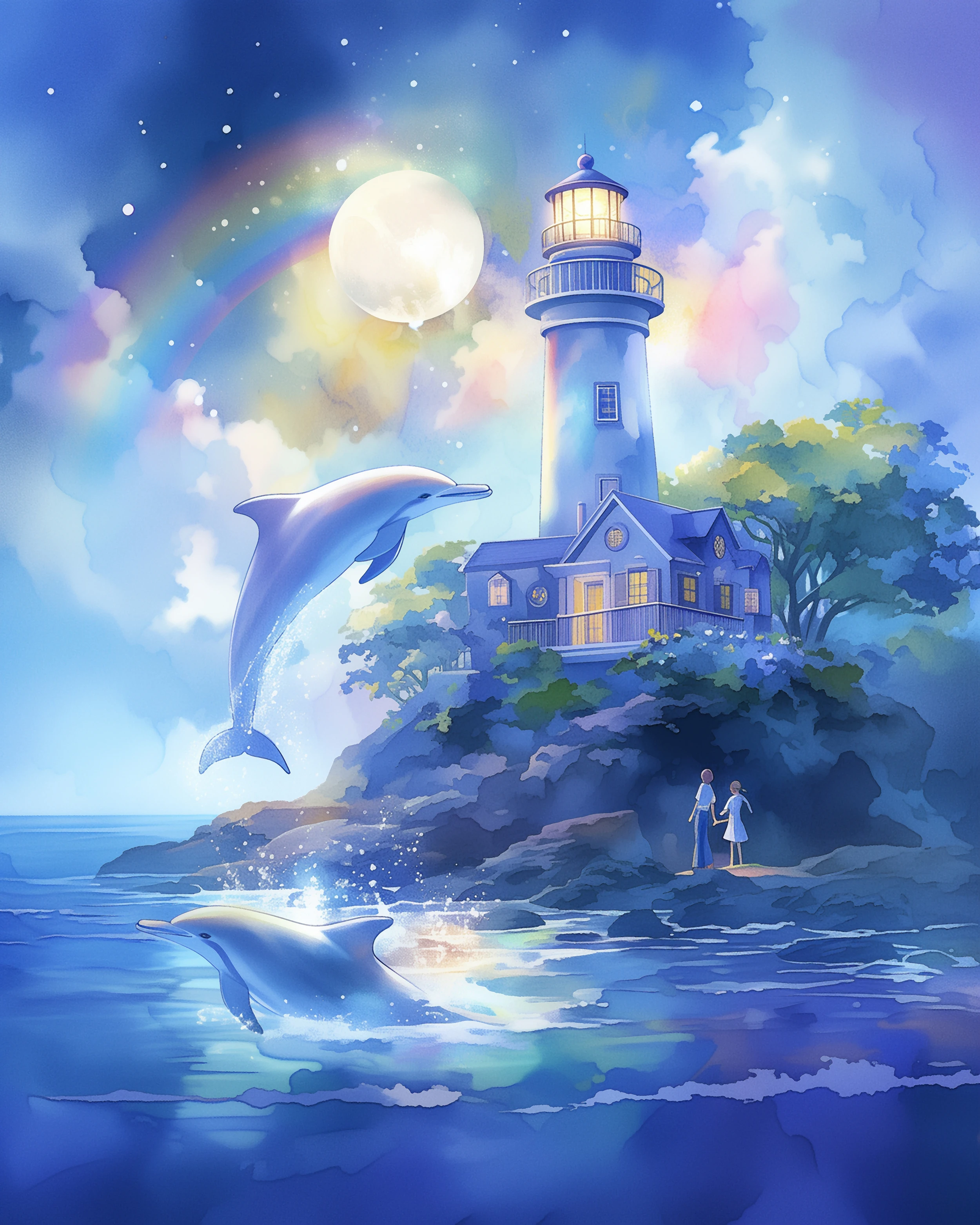 Ce papier peint féerique déploie un paysage maritime enchanteur dominé par un majestueux phare blanc aux reflets nacrés, gardien silencieux d’une côte rocheuse luxuriante. La technique d’aquarelle digitale confère à cette œuvre une douceur remarquable, où chaque trait se fond harmonieusement dans des nuances de bleu océan allant du cobalt profond aux turquoises cristallins. Des dauphins gracieux évoluent dans cette symphonie aquatique, l’un bondissant vers un ciel arc-en-ciel ponctué d’étoiles dorées, l’autre glissant dans les flots miroitants près du rivage. Une lune pleine baigne la scène d’une lumière opalescente, tandis qu’une charmante maison de gardien aux fenêtres illuminées évoque la chaleur du foyer. La végétation luxuriante qui couronne les falaises ajoute une note tropicale à cette composition, créant un équilibre parfait entre terre et mer.