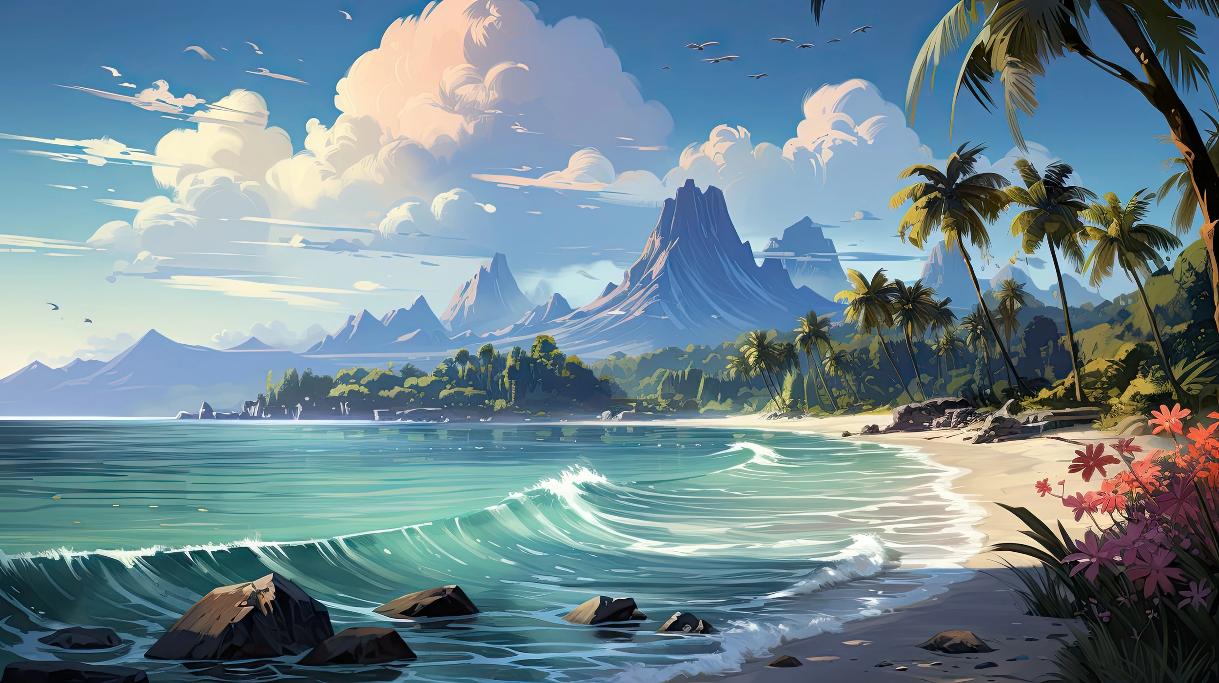 La végétation luxuriante déploie ses cocotiers élancés aux palmes généreuses, créant une canopée naturelle d’un vert profond et lumineux. Des fleurs tropicales aux teintes corail et pourpres ponctuent délicatement le premier plan, apportant une touche de couleur chaleureuse à cette symphonie visuelle. En arrière-plan, une chaîne montagneuse majestueuse aux pics acérés se dresse vers un ciel bleu azur, créant une perspective saisissante et une profondeur remarquable.