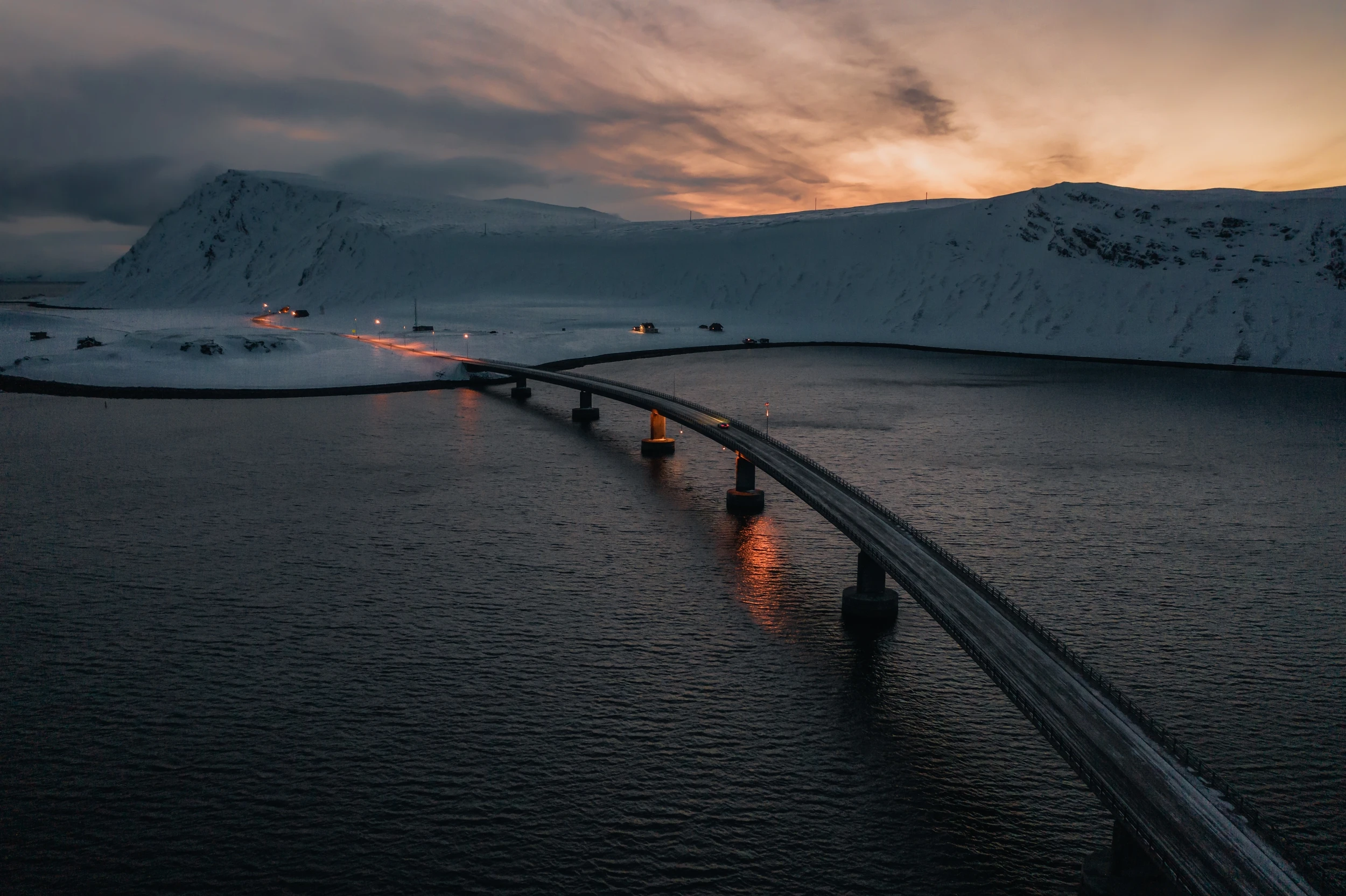 Lorsque les dernières lueurs du jour embrasent l’horizon arctique, un pont majestueux s’élance au-dessus des eaux sombres, créant une symphonie visuelle entre architecture moderne et grandeur sauvage des terres nordiques.