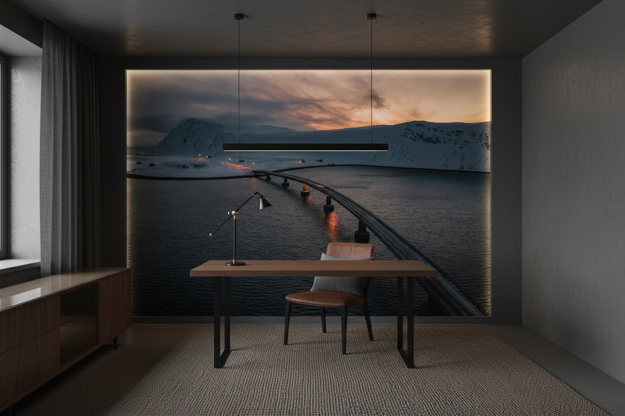 Cette décoration murale d’exception insuffle instantanément une atmosphère contemplative et sereine dans votre espace de vie. L’ambiance minimaliste et poétique qu’elle dégage invite à la méditation et à l’évasion, transformant votre intérieur en véritable refuge inspiré des paysages scandinaves. La sensation de grandeur et d’infini qu’évoque ce panorama arctique apporte une dimension spirituelle et apaisante à votre décoration.
