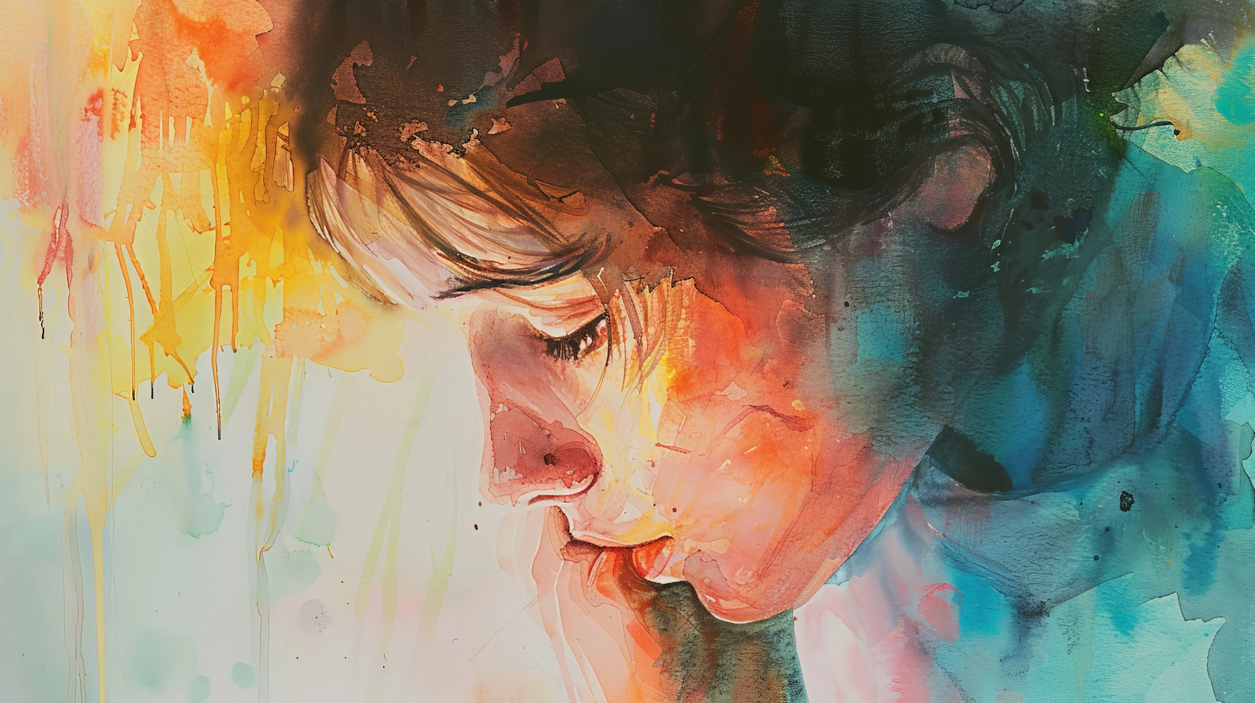 Cette création exceptionnelle révèle un portrait expressif sublimé par la technique de l’aquarelle moderne. Le visage, délicatement esquissé, emerge d’un tourbillon de couleurs où se mêlent les tons orangés flamboyants, les bleus profonds océaniques et les verts émeraude mystérieux. La chevelure se transforme en nuages d’encre sombre, contrastant magnifiquement avec les couleurs chaudes qui baignent le visage dans une lumière dorée. Les coulures de peinture s’étalent gracieusement, créant un effet de mouvement perpétuel qui insuffle une énergie créative incomparable à votre espace.