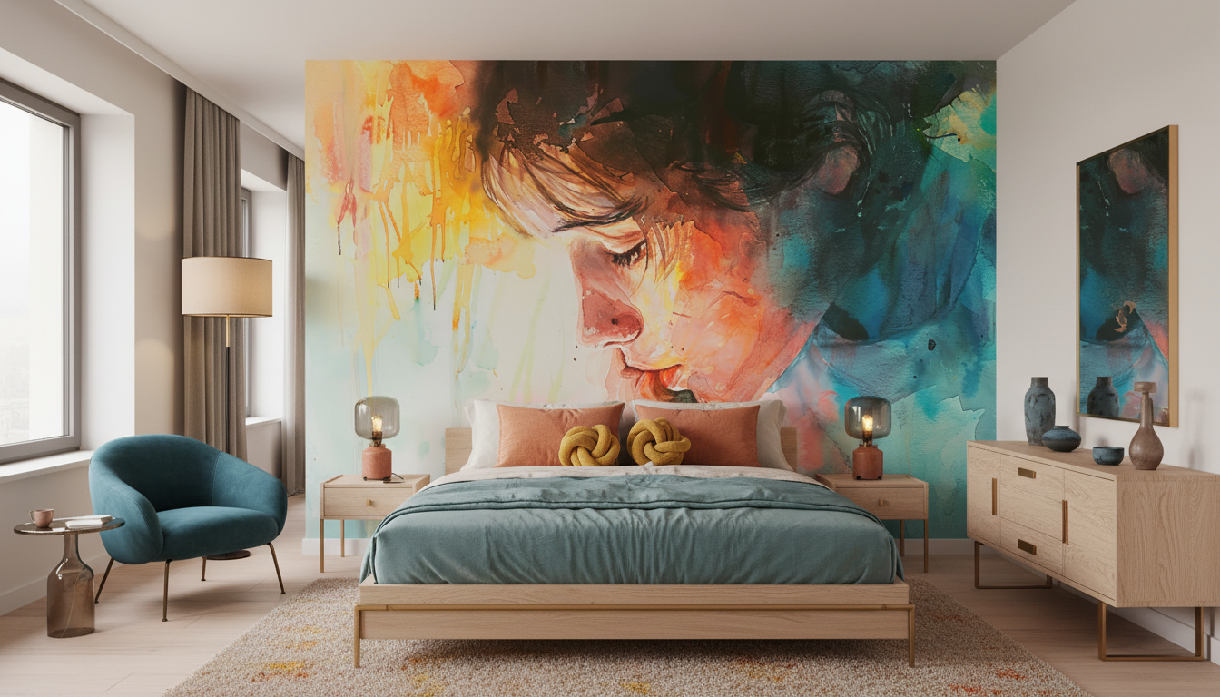 Cette décoration murale artistique s’harmonise parfaitement avec un style déco contemporaine mêlant élégance et audace. Complétez l’ambiance avec des coussins colorés reprenant les teintes du papier peint, quelques plantes vertes pour apporter une note naturelle, et des œuvres d’art aux lignes épurées pour créer une galerie personnelle raffinée.