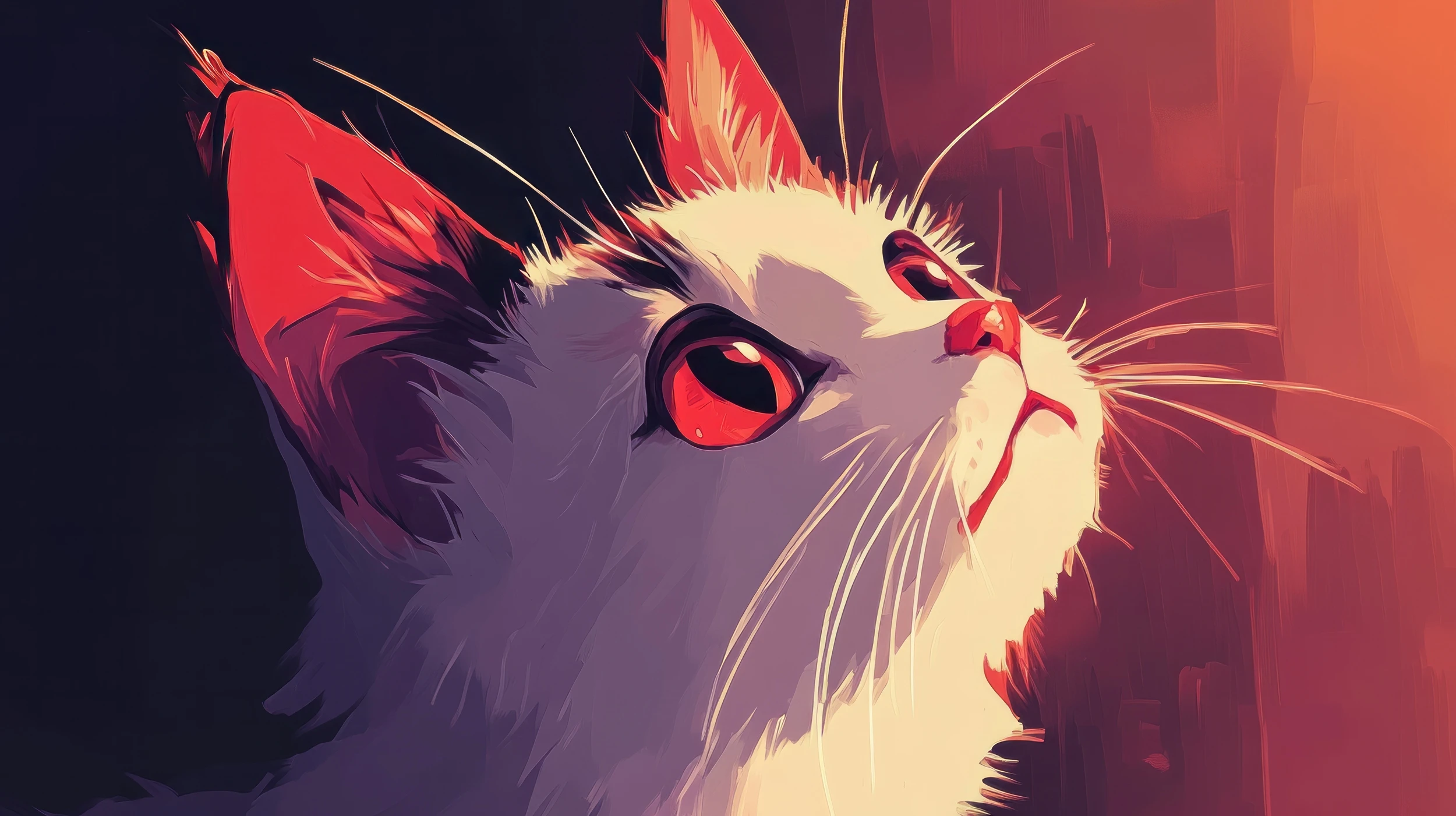 Ce papier peint artistique révèle le portrait saisissant d’un chat stylisé aux traits délicatement vectoriels, baigné dans une palette chromatique envoûtante. Les tons rouge corail se mêlent harmonieusement aux nuances violettes et aux teintes crème dorées, créant un dégradé lumineux d’une sophistication rare. Le style graphique moderne s’inspire de l’illustration numérique contemporaine, où chaque trait de moustache dorée et chaque reflet dans l’œil rouge rubis sont sublimés par un jeu de lumières dramatique. Les oreilles triangulaires aux pointes acérées et le pelage duveteux aux textures finement détaillées témoignent d’un travail artistique d’une précision remarquable.