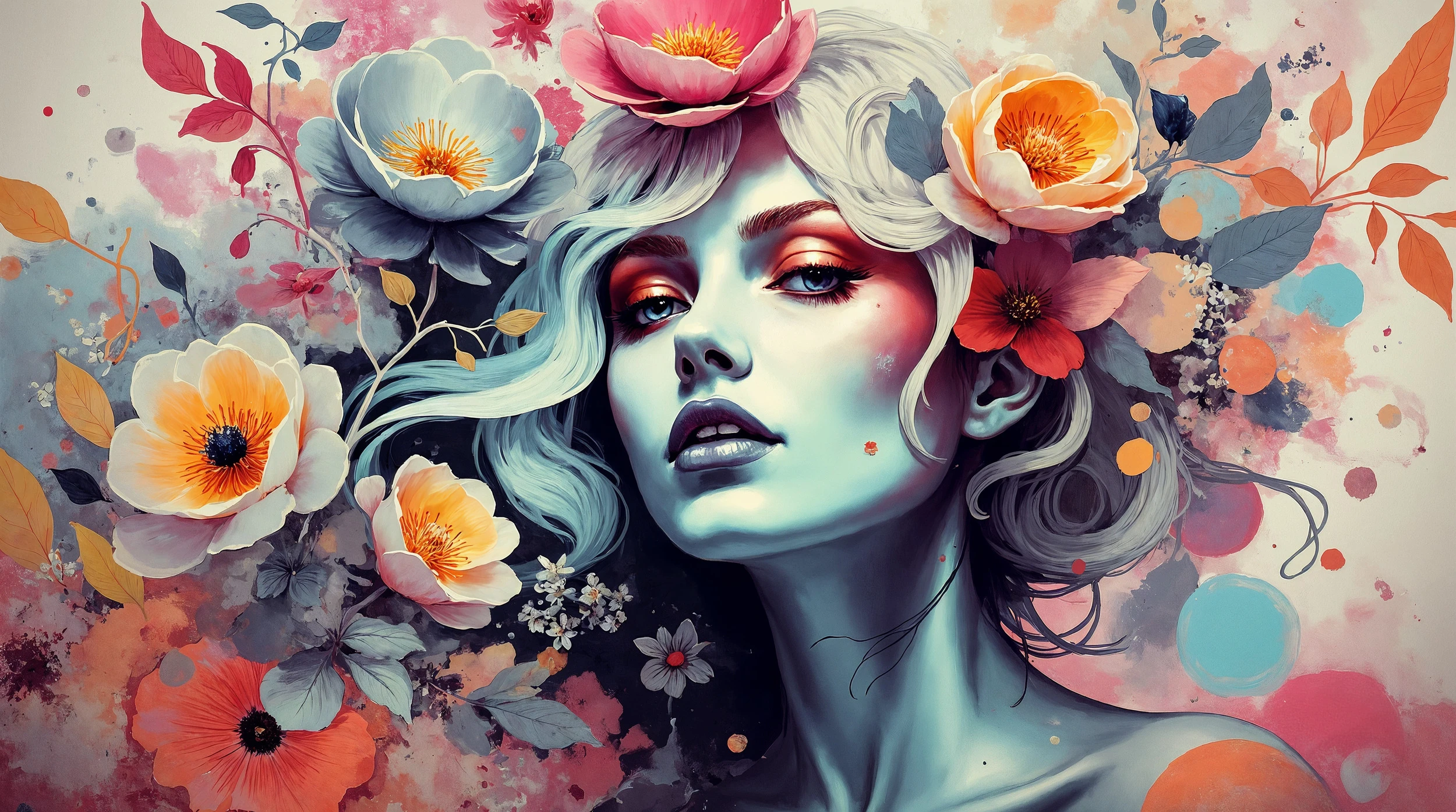 Cette œuvre murale exceptionnelle dévoile le portrait saisissant d’une femme aux cheveux ondulés d’un gris argenté, dont le regard perçant transperce l’âme. Son visage aux traits sculptés émerge d’un bouquet luxuriant de pivoines géantes et de fleurs stylisées, créant une composition florale d’une richesse inouïe. Les tons roses poudrés, les oranges lumineux et les bleus nacrés se mélangent dans un dégradé aquarelle d’une douceur infinie, tandis que les feuillages bleu-gris apportent une note de sophistication contemporaine.