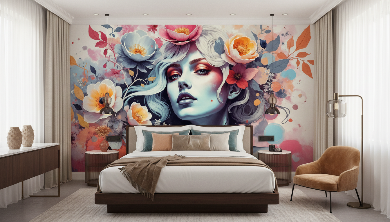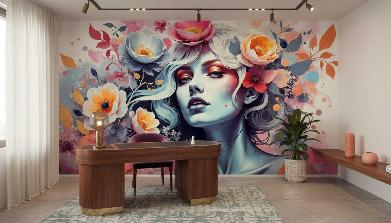 Ce papier peint portrait féminin trouve sa place idéale dans une chambre parentale moderne, où il créera un mur d’accent saisissant derrière la tête de lit. Dans un salon contemporain, il sublimera un espace lecture ou un coin détente. Pour un bureau créatif ou un dressing sophistiqué, cette œuvre murale stimulera l’inspiration quotidienne. Associez-le à du mobilier en bois clair, des textiles lin dans des tons neutres, et des accessoires dorés pour créer une harmonie parfaite. Les coussins roses poudrés et les objets déco cuivrés viendront faire écho aux nuances de la composition florale.