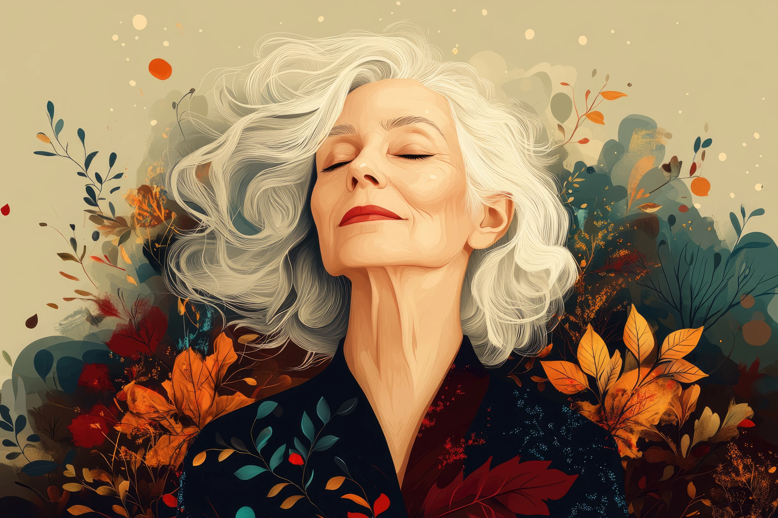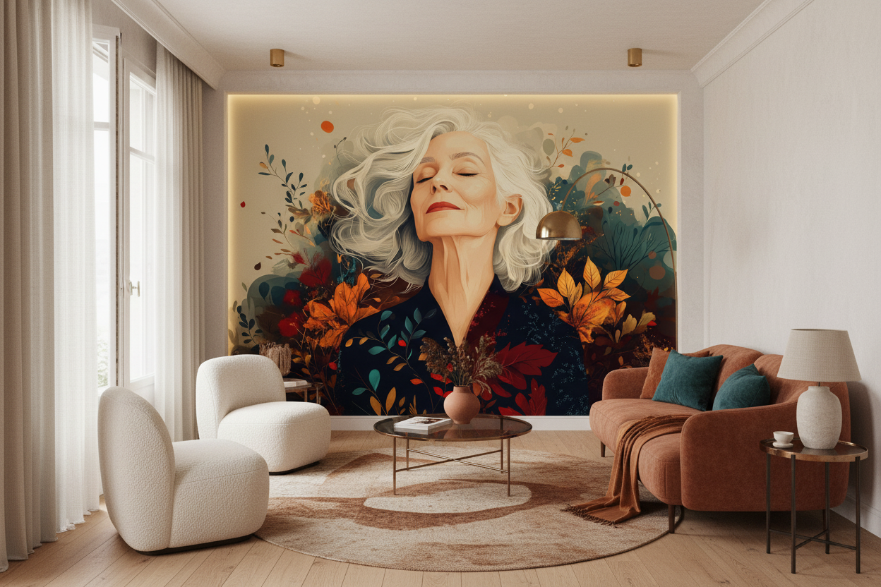 Laissez-vous envoûter par ce papier peint artistique qui capture l’essence même de la sérénité automnale, où une femme aux cheveux argentés s’abandonne à la douce mélancolie d’un moment suspendu dans le temps.