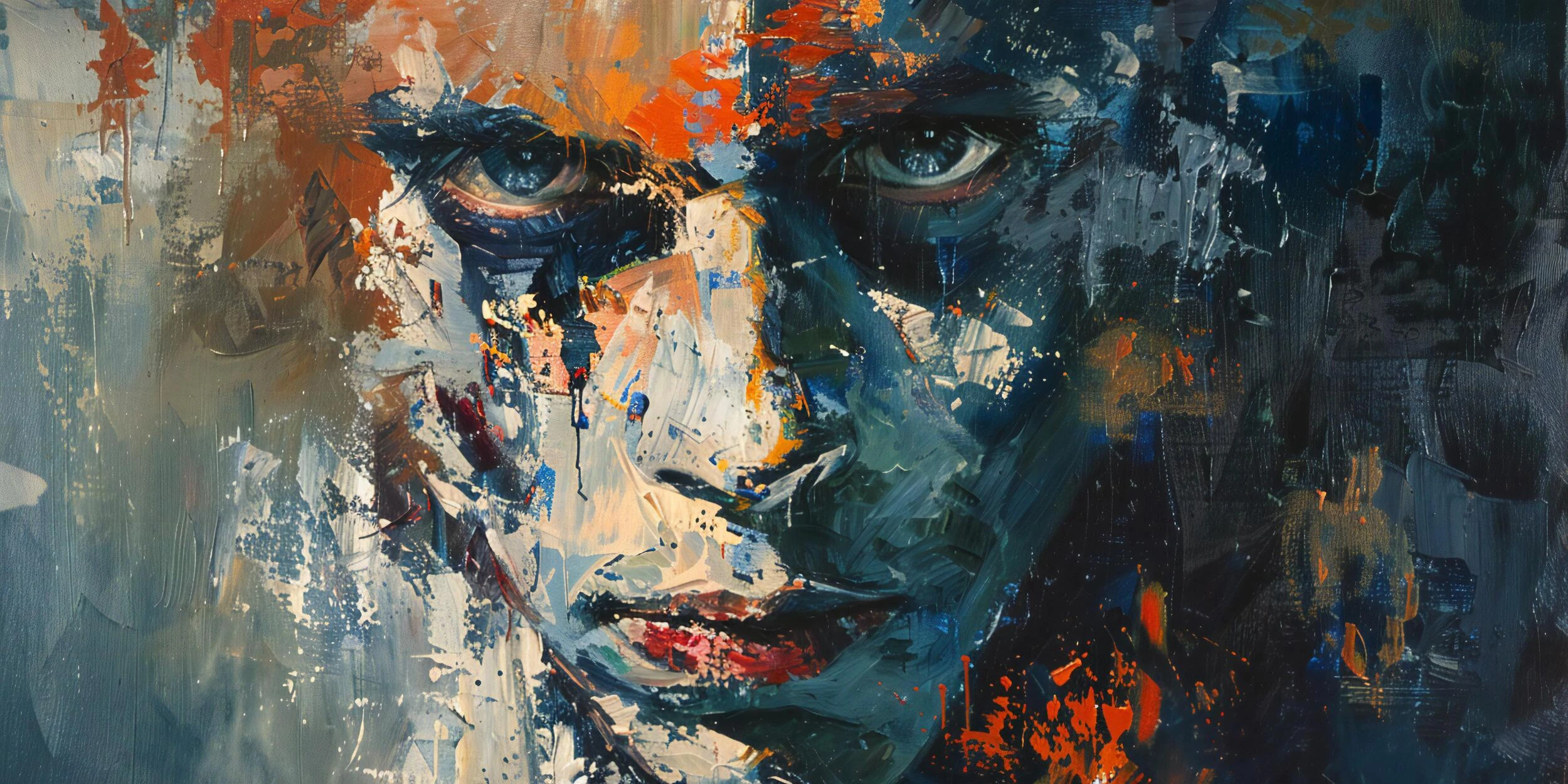 Ce papier peint expressionniste révèle un visage humain sublimé par une technique picturale audacieuse, où chaque coup de pinceau virtuel raconte une histoire. Les tons bleus profonds dominent la composition, créant des jeux d’ombres et de lumières saisissants sur les traits du personnage. Des éclats orange vif et des touches rouge vermillon viennent ponctuer cette symphonie chromatique, apportant chaleur et dynamisme à l’ensemble. Les nuances beiges et ocres adoucissent certaines zones du visage, créant un équilibre parfait entre force expressive and délicatesse artistique.