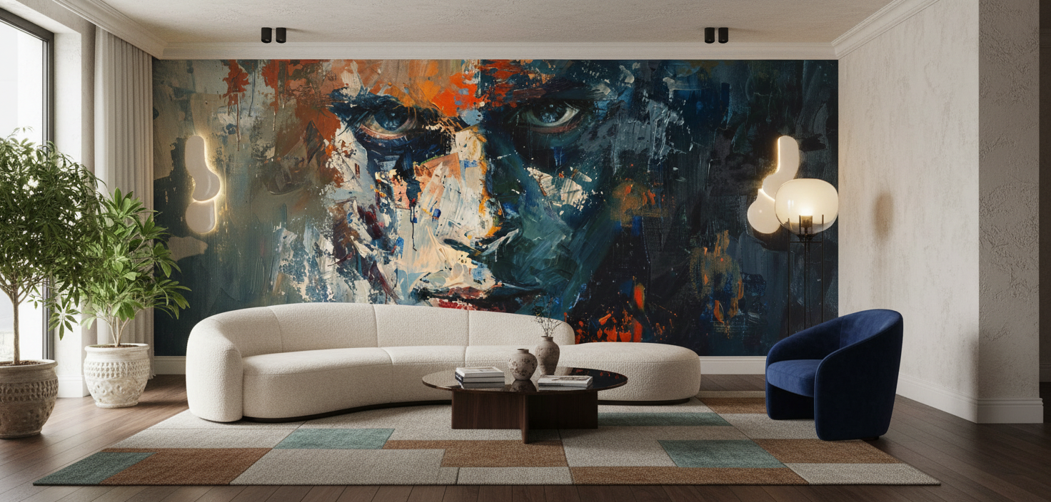 Pour magnifier cette œuvre d’art murale, optez pour des tons neutres dans le reste de la décoration : gris anthracite, blanc cassé et beige naturel créeront un écrin parfait. Quelques touches de cuivre patiné et de bois brut apporteront une dimension chaleureuse qui dialoguera harmonieusement avec les nuances chaudes du portrait.