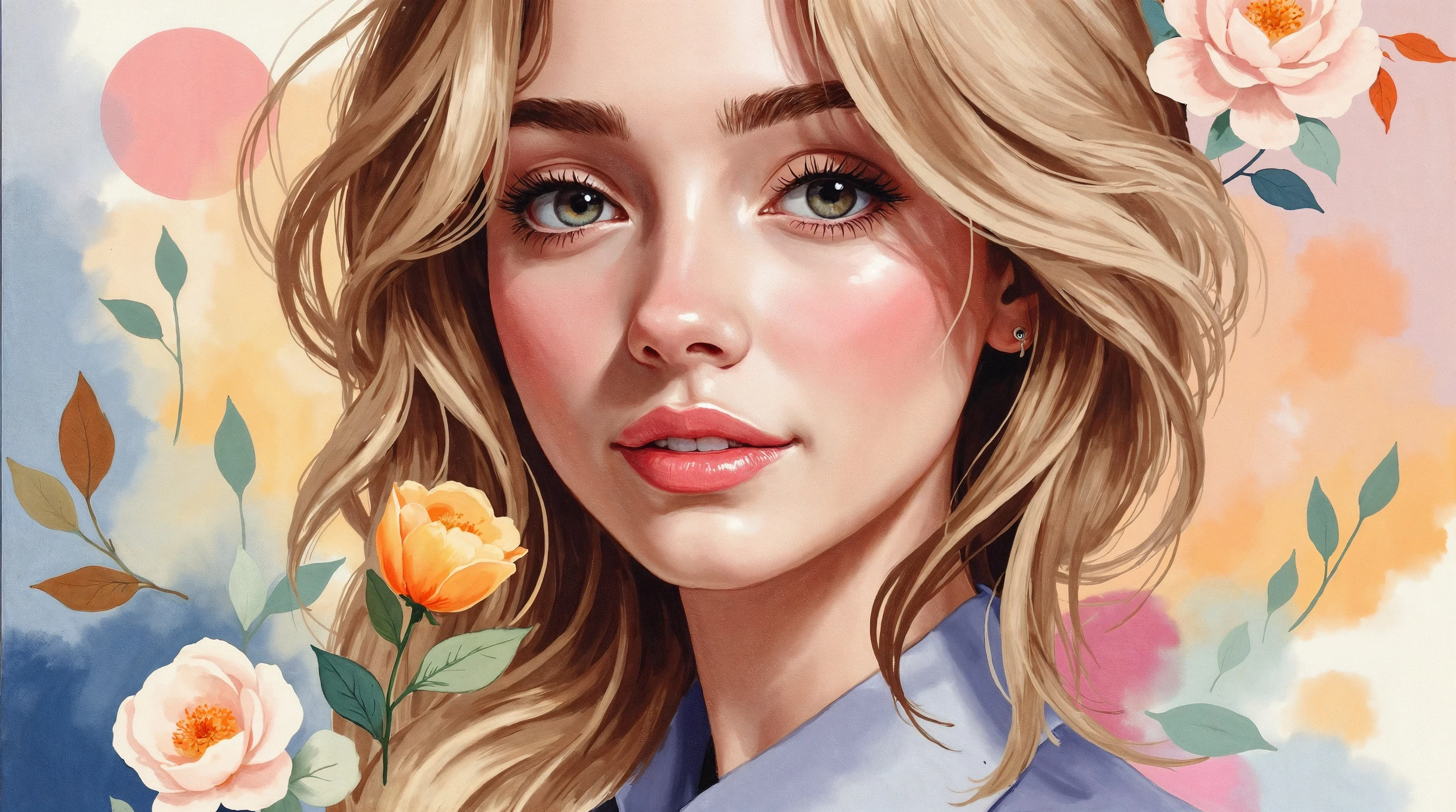Cette création murale présente un portrait féminin d’une finesse exceptionnelle, aux traits délicats rehaussés par des cheveux blonds ondulés qui captent la lumière avec un réalisme saisissant. Le regard perçant aux yeux bleus magnétiquement expressifs dialogue avec des fleurs d’aquarelle – roses nacrées et pivoines orangées – qui flottent gracieusement autour du visage. La technique picturale mélange subtilement le style hyperréaliste pour le portrait et l’aquarelle florale pour les motifs botaniques, créant un contraste artistique d’une rare élégance.