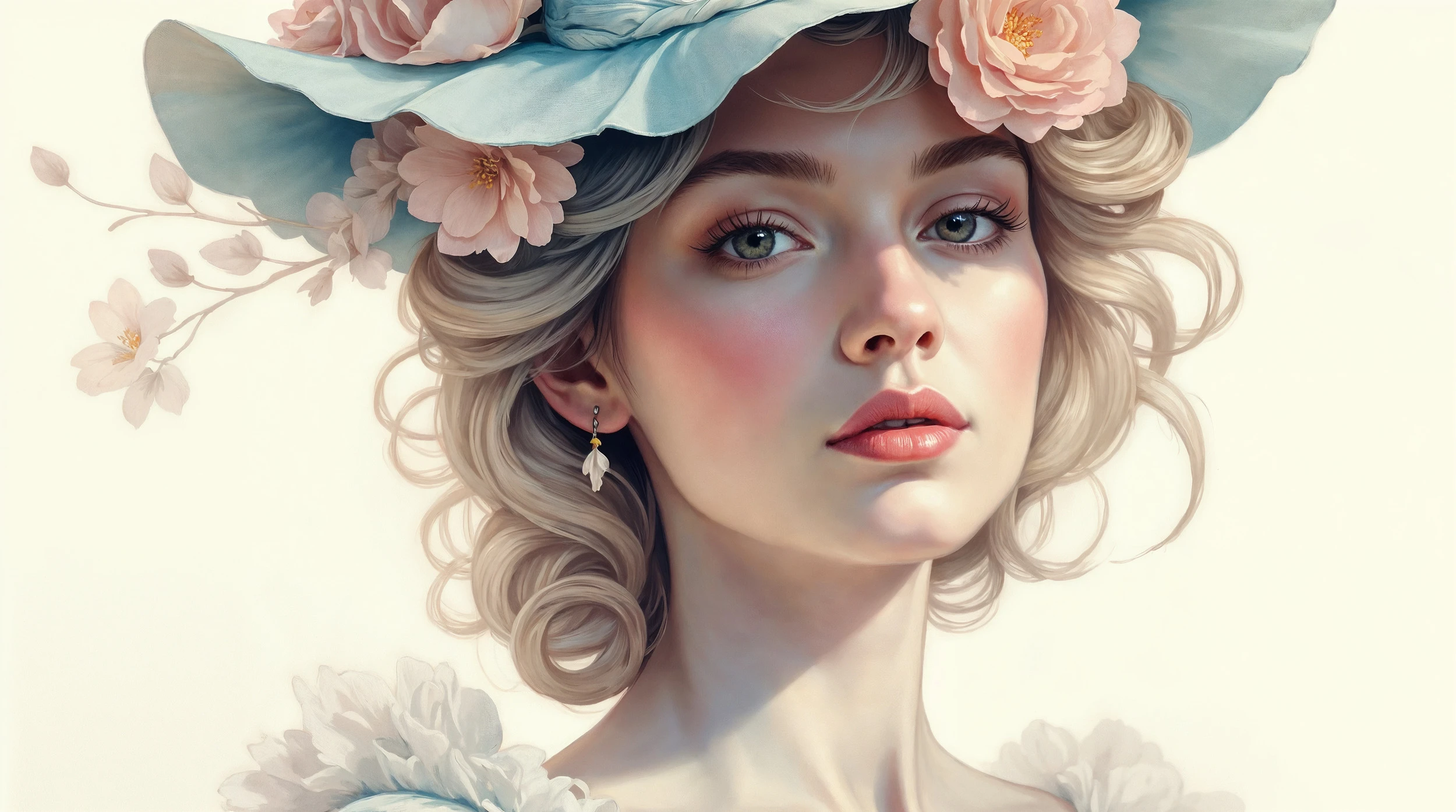 Ce papier peint portrait vintage révèle le visage délicat d’une femme aux traits fins, coiffée d’un élégant chapeau fleuri bleu pastel orné de roses poudré et de branches florales vaporeuses. Ses cheveux blonds ondulés encadrent harmonieusement son visage aux yeux bleus perçants, tandis que ses lèvres coral rosé apportent une touche de couleur subtile. L’ensemble baigne dans une palette de couleurs douces où dominent les tons pastel, les bleus poudrés, les roses nacrés et les beiges crémeux, créant une harmonie chromatique d’une élégance rare.