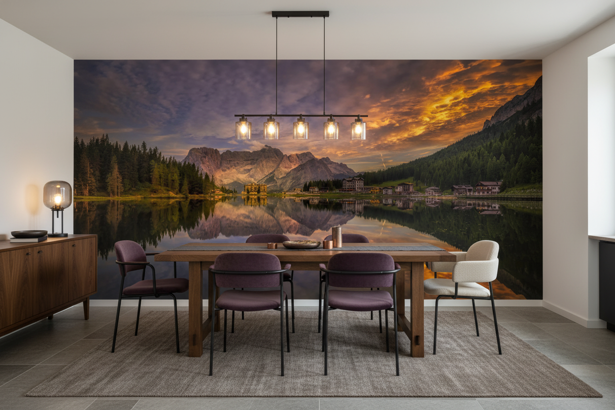 La palette chromatique de ce papier peint sublime mélange les tons chauds du coucher de soleil – ocre, orange, rose poudré – avec les nuances froides des sommets et de l’eau – bleu profond, gris ardoise, vert sapin. Cette harmonie colorielle exceptionnelle transforme instantanément votre intérieur en une fenêtre ouverte sur la nature alpine.