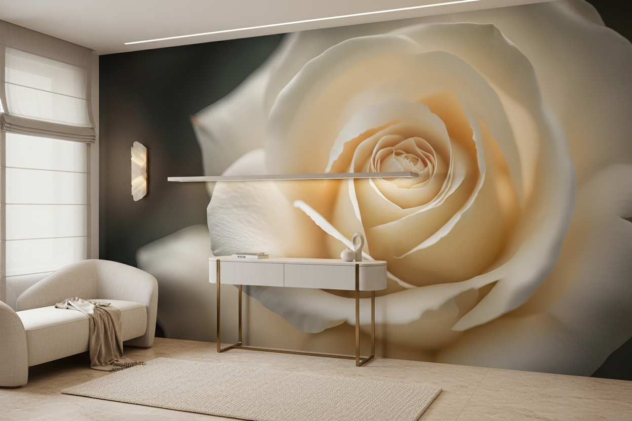 Ce papier peint floral sublime capture toute la magnificence d’une rose blanche aux nuances crémeuses et dorées, photographiée dans un style macro d’une précision époustouflante. Les pétales soyeux se déploient en spirales harmonieuses, révélant un cœur chaleureux teinté d’orange pêche qui rayonne avec une tendresse infinie. Cette rose géante au réalisme saisissant transforme votre mur en une véritable œuvre d’art botanique, où chaque détail de la texture veloutée des pétales semble presque palpable.