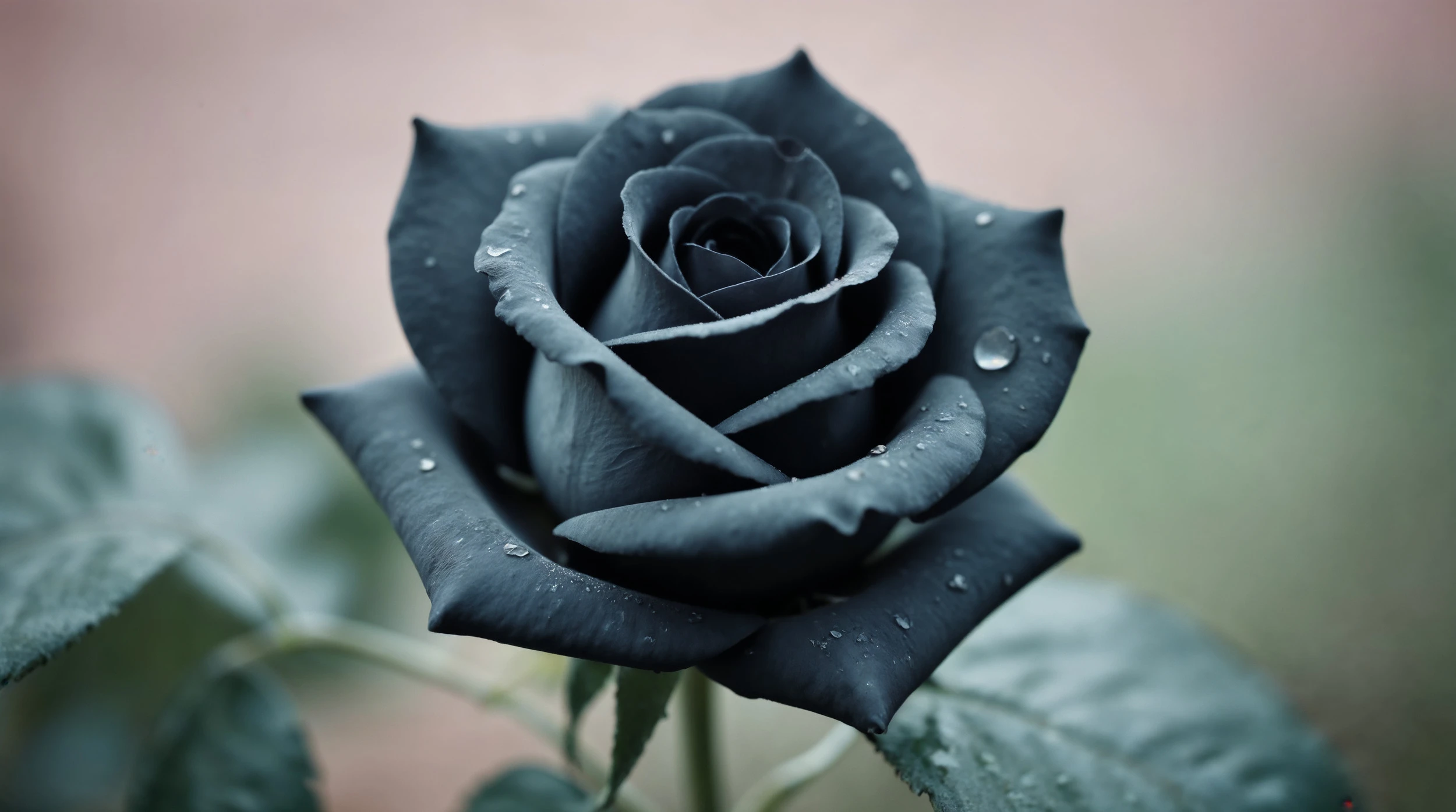 Ce papier peint floral contemporain présente une composition saisissante centrée sur une magnifique rose noire aux pétales veloutés, délicatement perlés de gouttelettes d’eau cristallines. Le motif révèle chaque détail avec une précision photographique : les courbes sensuelles des pétales qui s’épanouissent en spirales parfaites, le contraste saisissant entre les tons anthracite profonds de la fleur et le feuillage vert tendre qui l’entoure. L’arrière-plan se fond dans un flou artistique aux nuances roses poudrées, créant une profondeur de champ qui sublime le sujet principal et lui confère une dimension presque sculpturale.