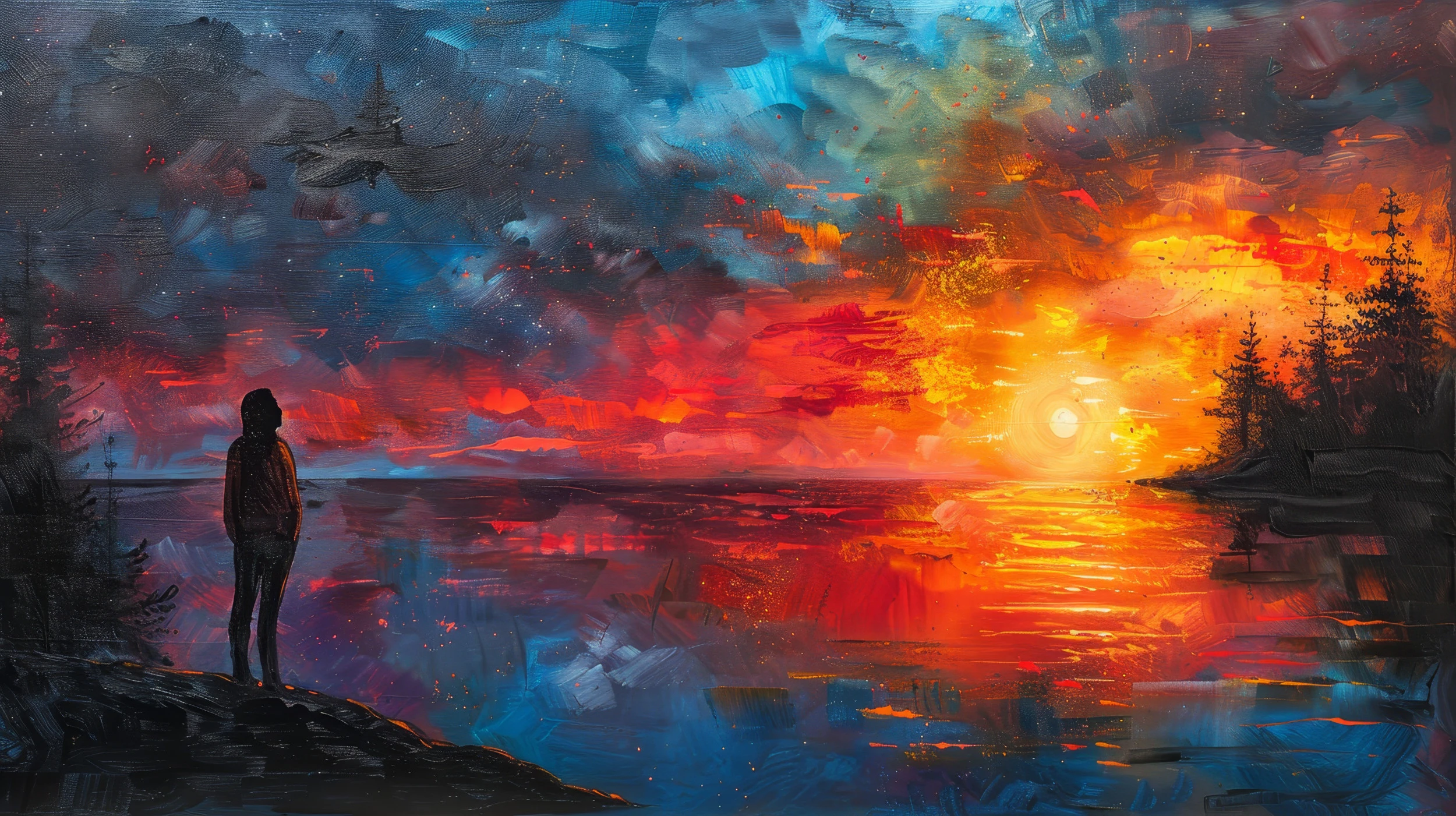 Quand les derniers rayons du soleil embrasent l’horizon et que la nuit étoilée commence son ballet cosmique, une silhouette solitaire contemple ce spectacle grandiose où se mêlent les flammes du couchant et l’immensité céleste.