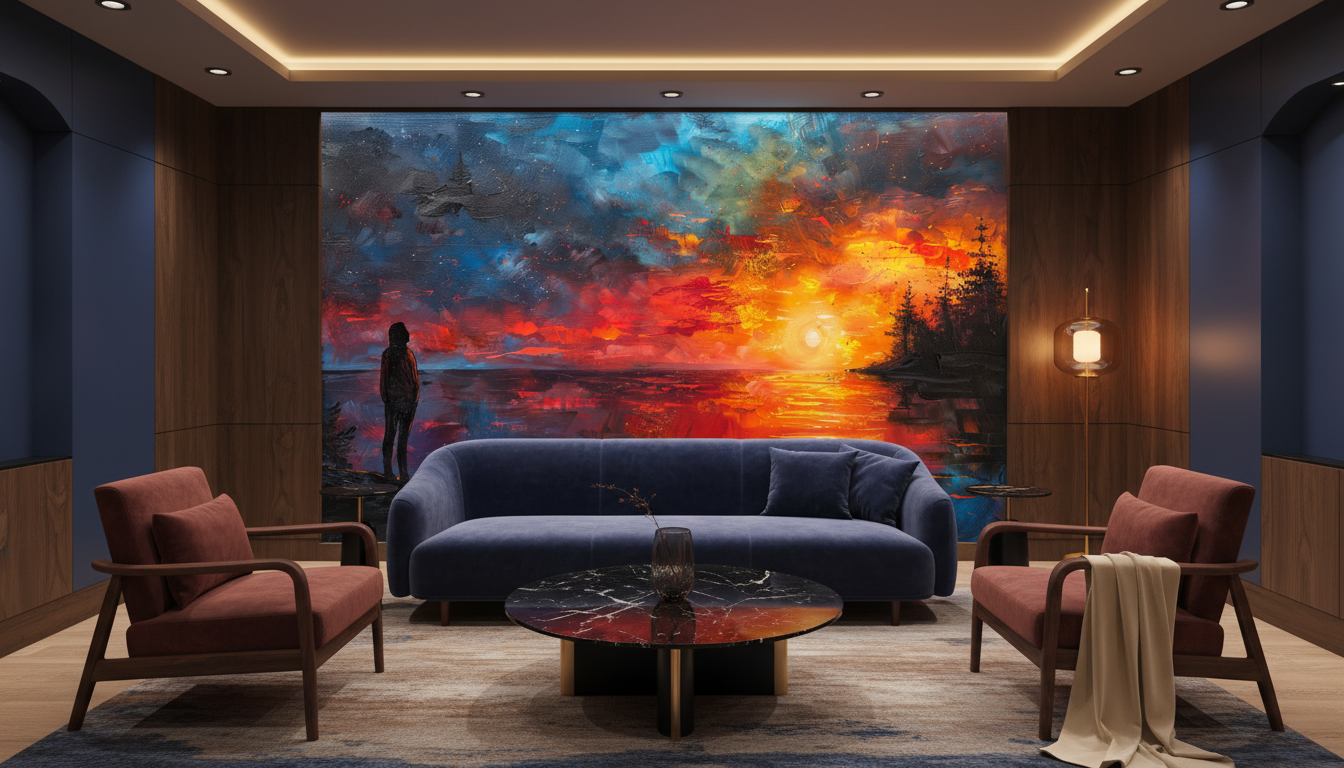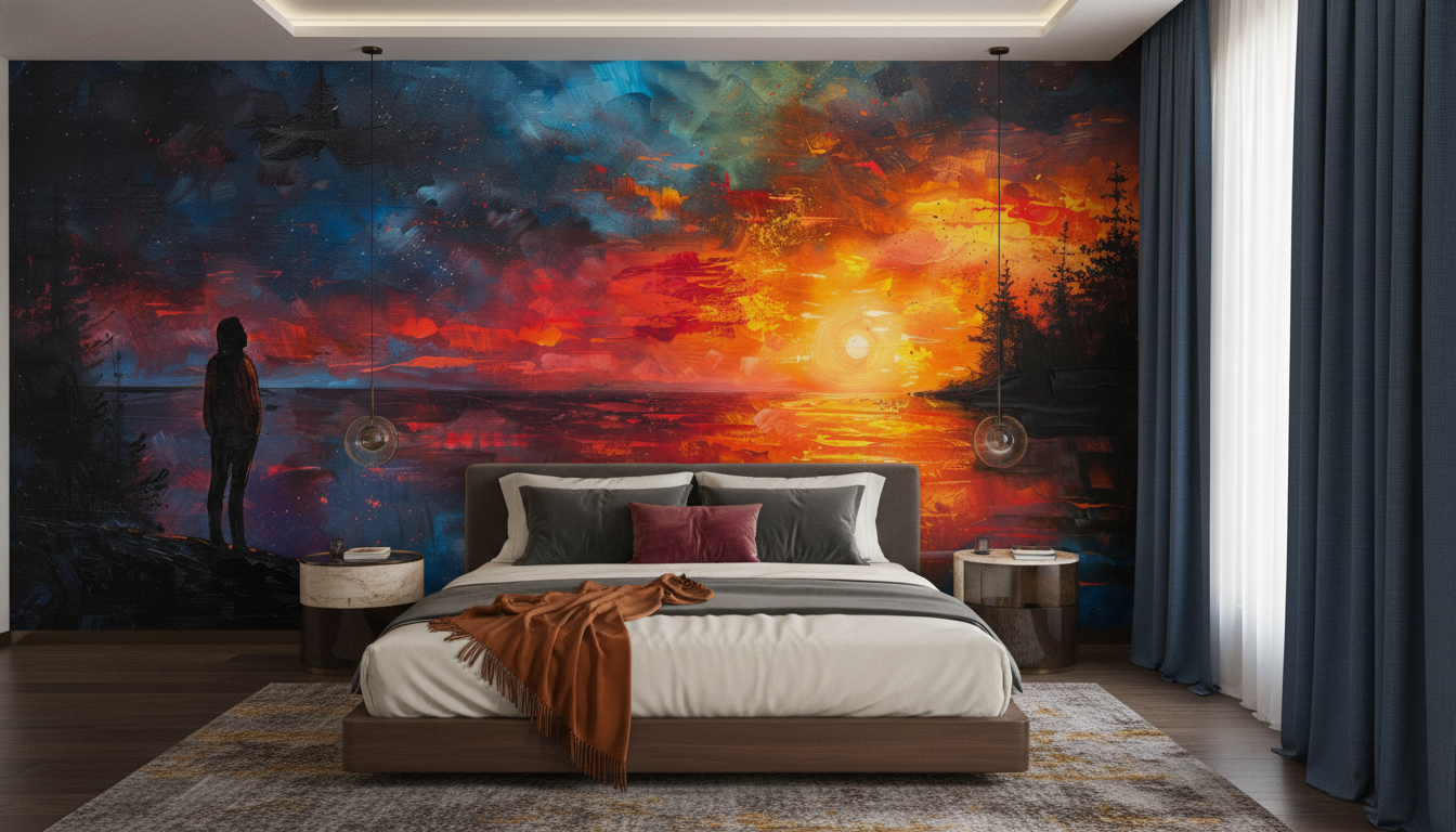 Ce papier peint artistique trouve naturellement sa place dans un salon contemporain où il sublimera un mur d’accent derrière un canapé en velours bleu nuit ou en cuir cognac. Dans une chambre parentale, il créera une atmosphère romantique et sereine, particulièrement mis en valeur par du mobilier en bois foncé et des textiles aux tons neutres. Un bureau ou espace de travail bénéficiera également de cette source d’inspiration visuelle, favorisant créativité et réflexion.