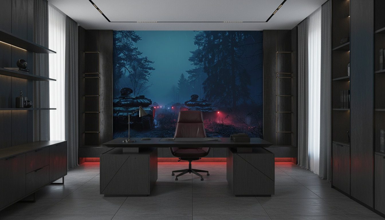 Cette fresque murale exceptionnelle révèle une scène nocturne d’un réalisme troublant, où deux chars de combat se fondent dans un paysage forestier baigné d’une lumière crépusculaire. Les tons bleu-gris profonds dominent cette composition, créant une palette chromatique sophistiquée qui oscille entre le bleu nuit et les nuances ardoise. Les accents rouge vermillon des phares et feux arrière apportent une touche dramatique qui réchauffe cette symphonie de bleus. Le style graphique, d’un réalisme photographique saisissant, évoque l’univers du concept art numérique et des productions cinématographiques contemporaines.