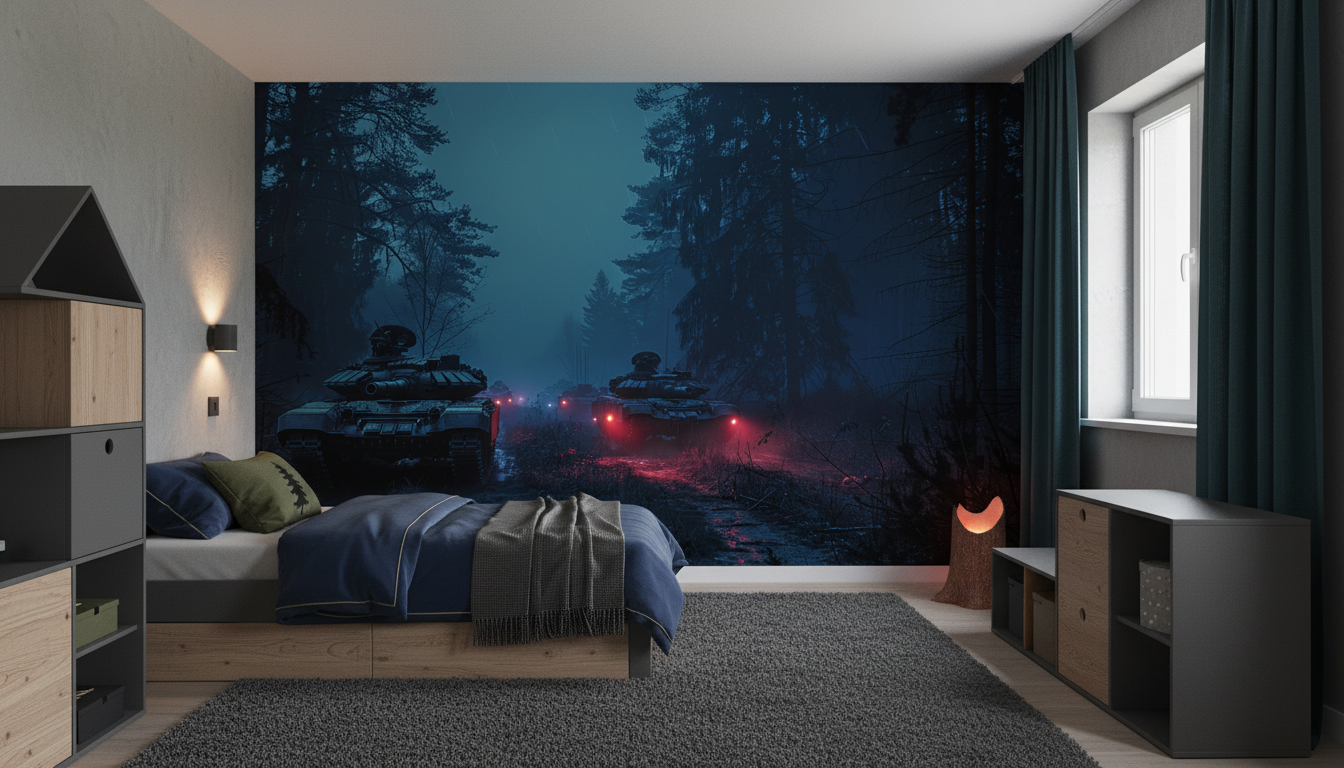 Transformez votre espace avec une fresque murale immersive. Tanks militaires en forêt nocturne mystérieuse, lumières rouges. Ce papier peint sur mesure crée une ambiance cinématographique unique. Idéal pour salon moderne, bureau ou chambre ado.