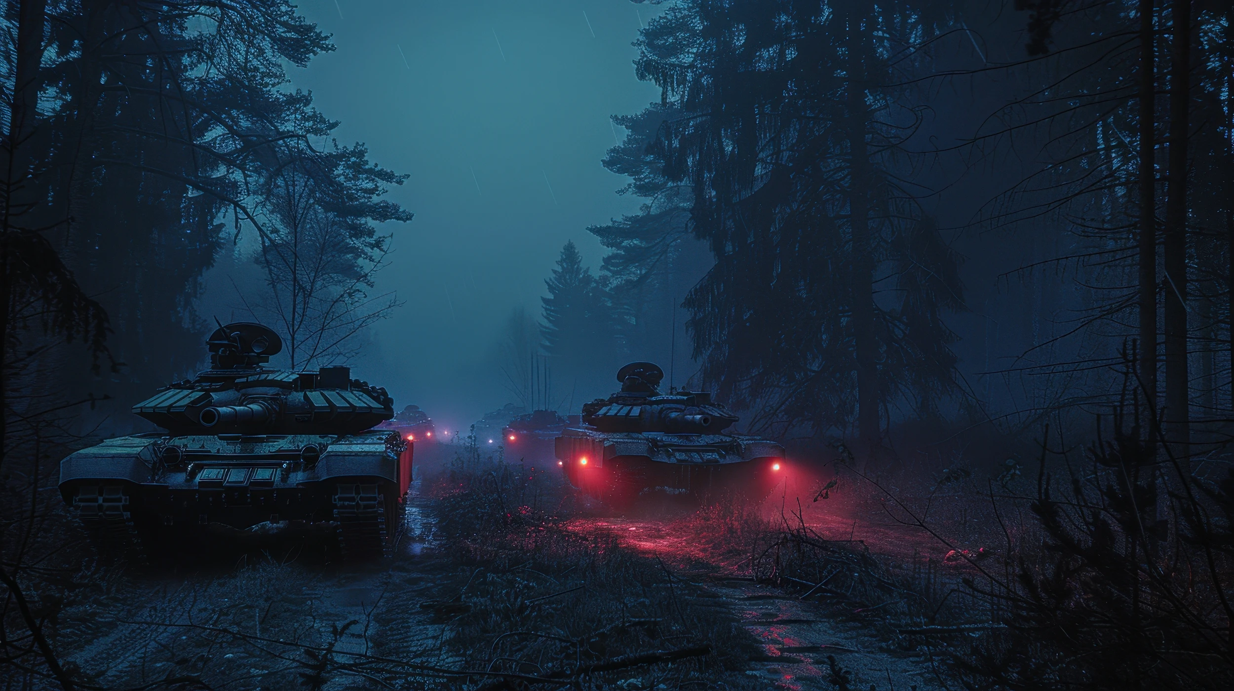 Tanks Militaires dans Forêt Brumeuse aux Éclairages Rouges Nocturnes