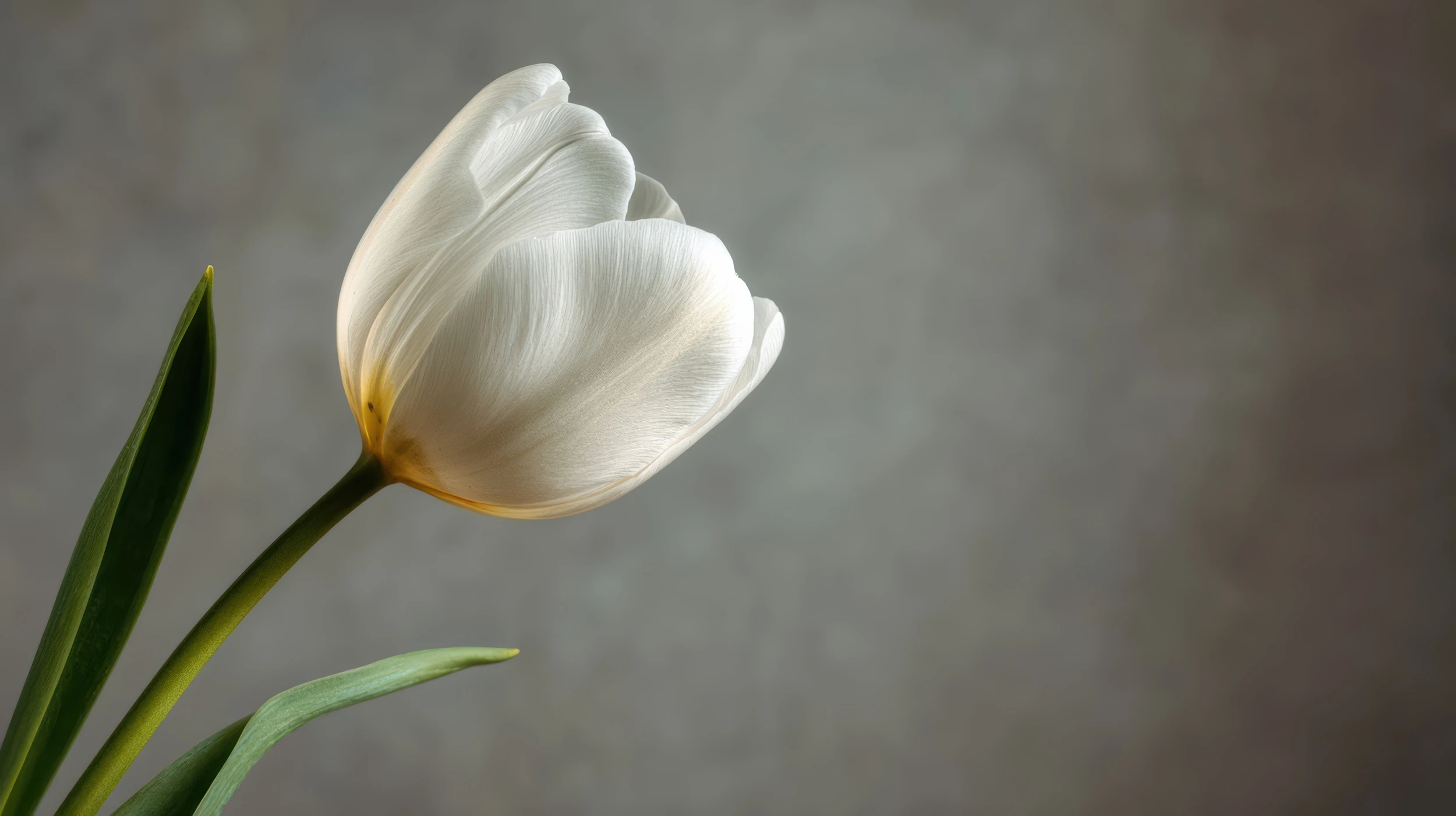 Cette création artistique met en scène une tulipe blanche immaculée aux pétales délicatement ourlés, magnifiée par un rendu photographique d’une précision saisissante. Le style réaliste contemporain révèle chaque nervure, chaque courbe gracieuse de cette fleur emblématique du renouveau. Les feuilles vert tendre aux lignes épurées encadrent harmonieusement cette beauté florale, créant une composition équilibrée et sophistiquée. La palette de couleurs naturelles se décline en nuances subtiles : le blanc crème lumineux des pétales, rehaussé de touches dorées à la base, dialogue avec les verts frais du feuillage sur un fond neutre gris perle.
